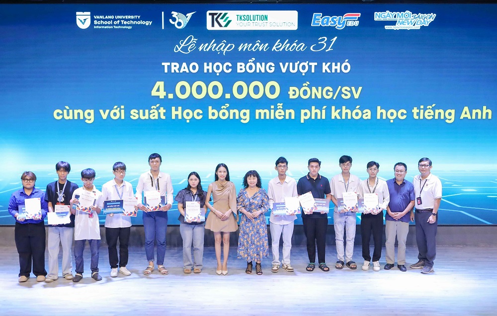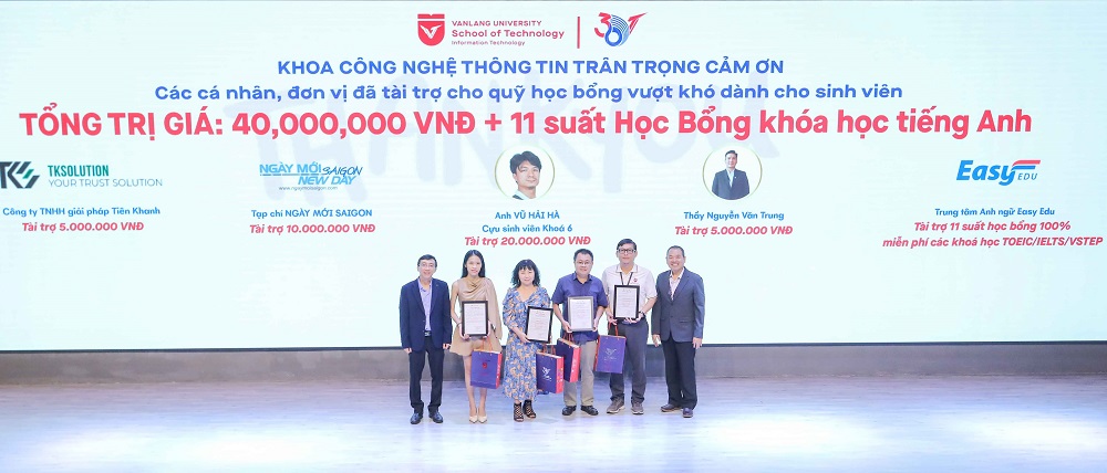 Dịp này, các nhà tài trợ gồm: Tạp chí Ngày Mới Sài Gòn; Công ty TNHH Giải pháp Tiên Khanh; Hệ thống Anh ngữ Easy Edu; Anh Vũ Hải Hà – Cựu sinh viên Khóa 6, Khoa CNTT và Thầy Nguyễn Văn Trung – Giảng viên Khoa CNTT, Trường Đại học Văn Lang đã trao tặng 40 triệu đồng tiền mặt cùng 11 suất học bổng tiếng Anh toàn phần đến các sinh viên vượt khó.