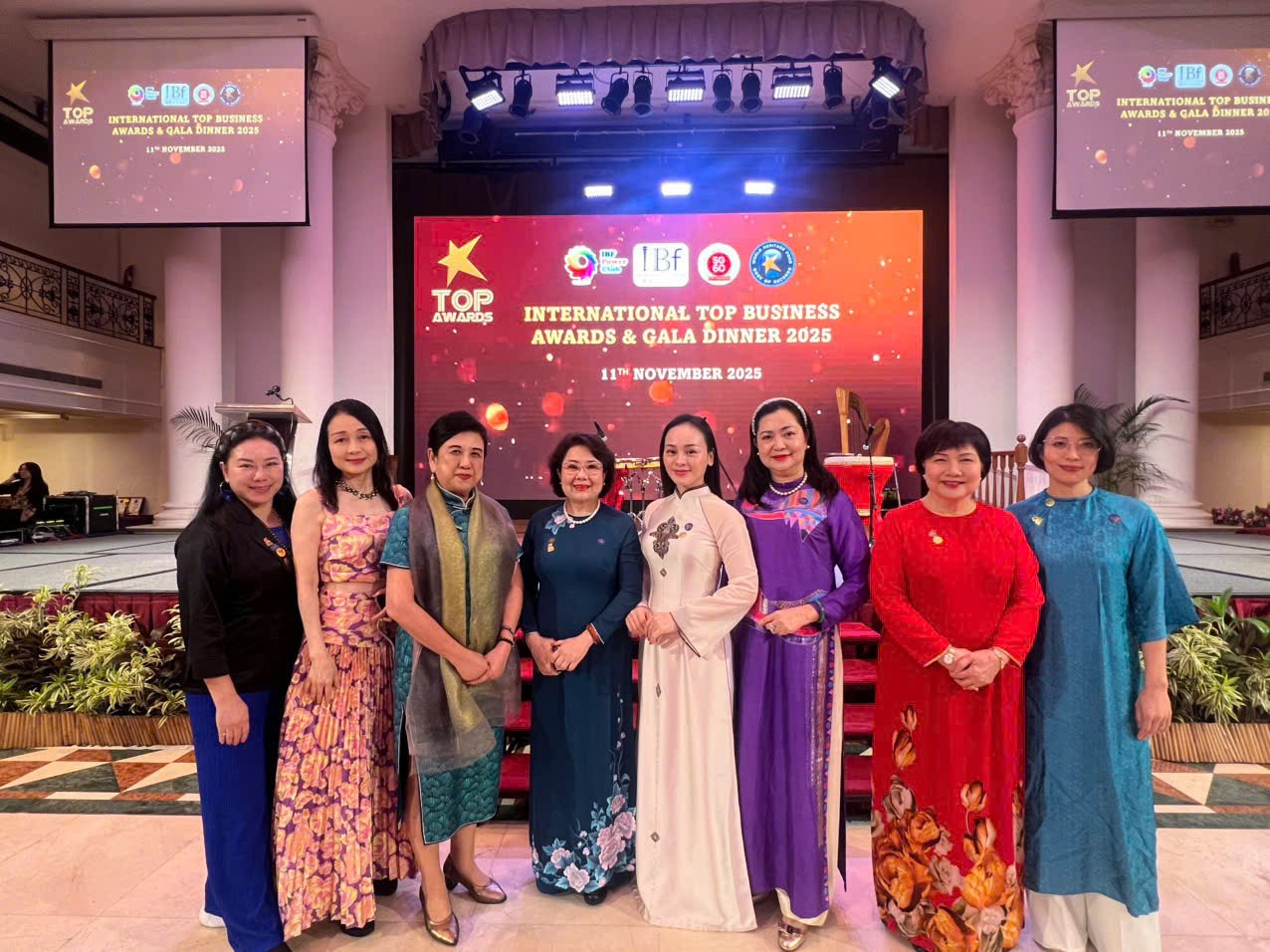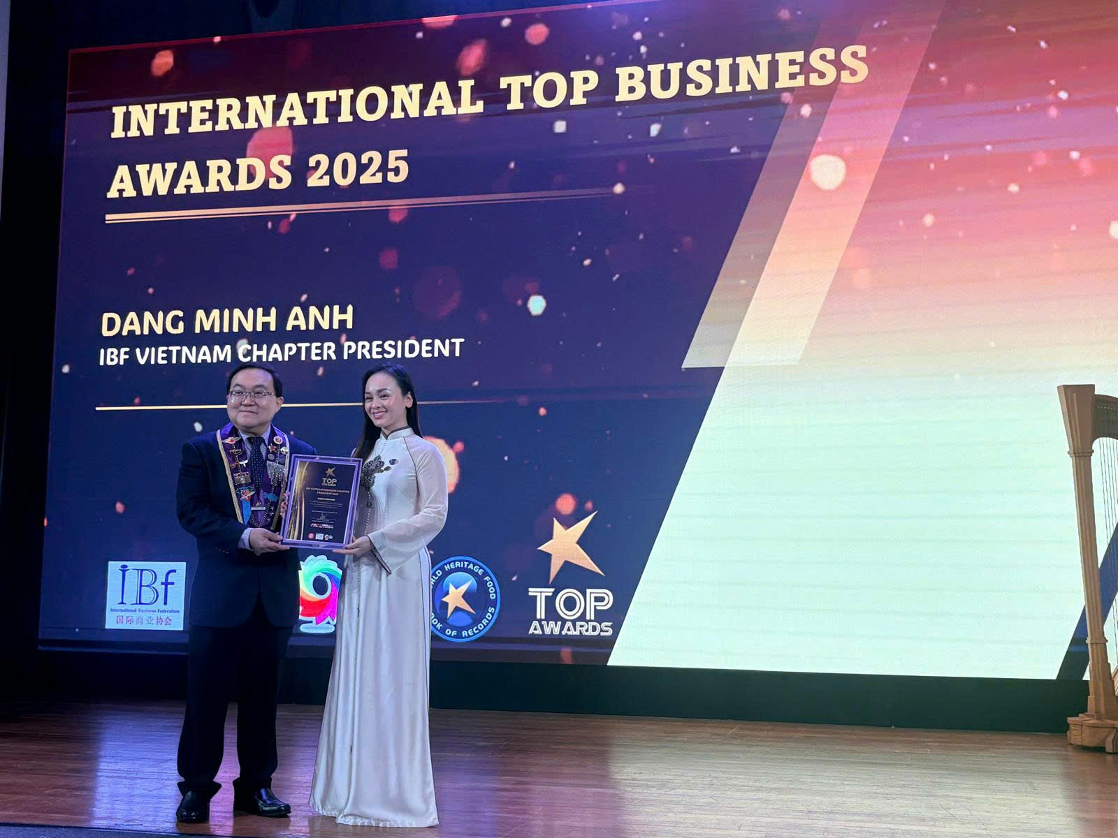Bà Đặng Minh Anh - Chủ tịch Liên đoàn doanh nhân Quốc tế Việt Nam Singapore nhận giải thưởng cao quý Doanh nghiệp hàng đầu quốc tế.