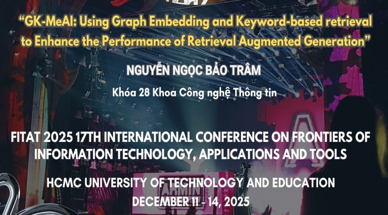 Dưới sự hướng dẫn của thầy Phan Hồ Viết Trường, sinh viên Nguyễn Ngọc Bảo Trâm vừa có thêm một bài báo được chấp nhận đăng tại hội nghị FITAT 2025 tổ chức tại trường Đại học Sư phạm Kỹ thuật TPHCM từ ngày 11 – 14/12/2025. Bài báo có tựa đề “GK-MeAI: Using Graph Embedding and Keyword-based retrieval to Enhance the Performance of Retrieval Augmented Generation”. Công trình nghiên cứu này là sự cải tiến từ hệ thống MeAI về tác dụng phụ của thuốc mà sinh viên Bảo Trâm đã xây dựng và trình bày tại hội nghị ICCASA 2025, một hệ thống tạo sinh dựa trên truy vấn tăng cường (Retrieval Augmented Generation - RAG) cho hệ hỏi đáp. Công trình mới này giải quyết hai vấn đề: chọn nguồn tài liệu liên quan đến câu truy vấn thông qua nhúng đồ thị trong trường hợp thiếu liên kết và sử dụng kỹ thuật trích xuất từ khóa nhằm tăng độ chính xác lựa chọn tập tài liệu ứng viên sinh câu trả lời về tác dụng phụ của thuốc nhằm hạn chế rủi ro cho bệnh nhân.