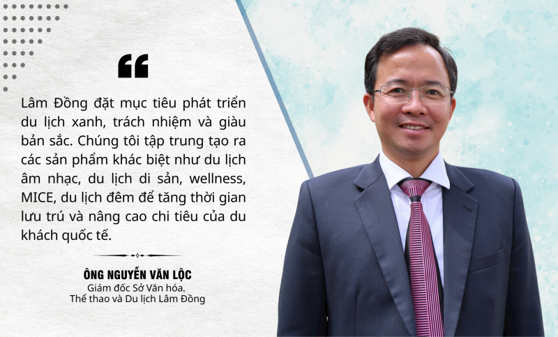 Trước sự chuyển dịch trong hành vi du lịch toàn cầu, Lâm Đồng đã xác định văn hóa là trục phát triển cốt lõi trong chiến lược dài hạn. Ông Nguyễn Văn Lộc, Giám đốc Sở Văn hóa, Thể thao và Du lịch Lâm Đồng cho biết tỉnh đang triển khai đồng bộ nhiều nhóm giải pháp để đưa du lịch trở thành ngành kinh tế mũi nhọn theo hướng bền vững và hội nhập quốc tế sâu rộng.