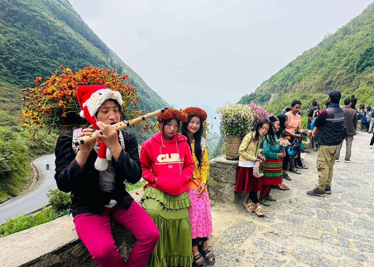 Các em nhỏ hồn nhiên gùi hoa, thổi sáo chào đón khách du lịch tại đèo Thẩm Mã, xã Phố Bảng