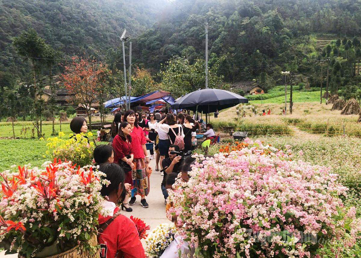 Khách du lịch trải nghiệm, check in tại cánh đồng hoa tam giác mạch, làng văn hóa du lịch Lũng Cẩm