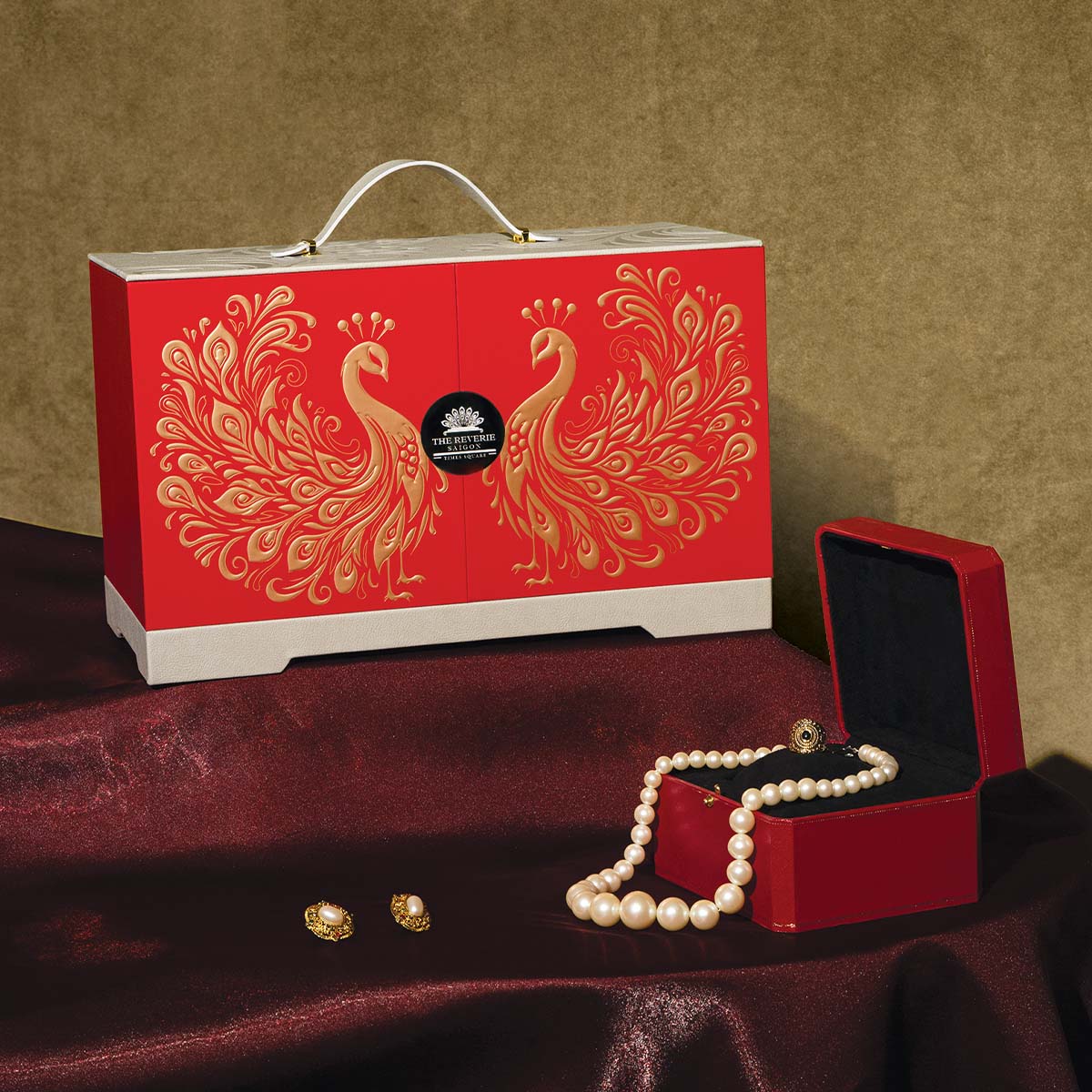 Hộp quà “Kim Bảo Phú Quý” sử dụng chất liệu da cao cấp với các họa tiết dập chìm, cùng điểm nhấn là đôi Khổng tước ánh kim nổi bật trên nền nhung đỏ mềm mại, tạo nên tổng thể vừa sang trọng vừa độc bản. Hộp quà hai tầng bao gồm vang, tổ yến và mứt trái cây cao cấp. Mỗi hộp quà như là lời chúc cát tường, biểu trưng cho tài lộc và thịnh vượng mà The Reverie Saigon gửi gắm đến những khách hàng trân quý.