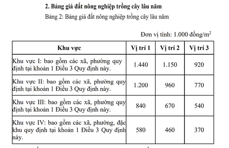 Đồng thời, theo dự thảo bảng giá đất nông nghiệp đã niêm yết lấy ý kiến của Sở Nông nghiệp và Môi trường ngày 26/11. Cụ thể, giá đất nông nghiệp trồng cây hàng năm thấp nhất là 300.000 đồng/m2, cao nhất là 1.200.000 đồng/m2; và giá đất nông nghiệp trồng cây lâu năm thấp nhất 370.000 đồng/m2, cao nhất là 1.440.000 đồng/m2.