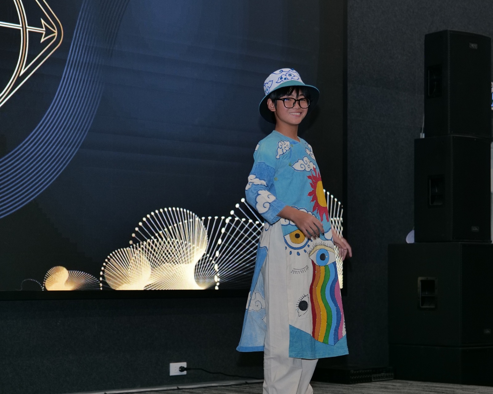 Với thiết kế vẽ tay trên chất liệu cotton, Nhà thiết kế Vũ Huy đã đưa họa tiết đôi mắt trải dài trên thân áo - là biểu tượng của sự thức tỉnh, quan sát và khát vọng thấu hiểu.