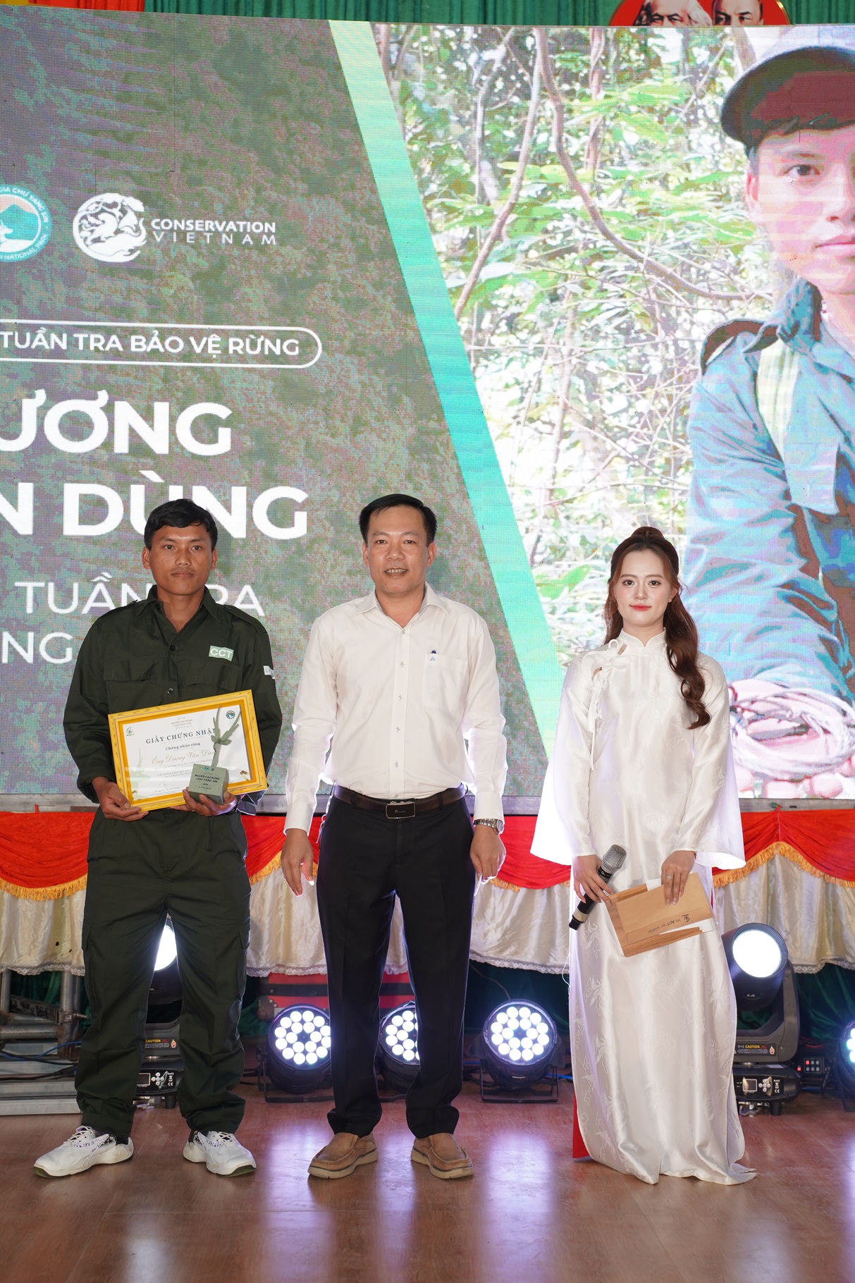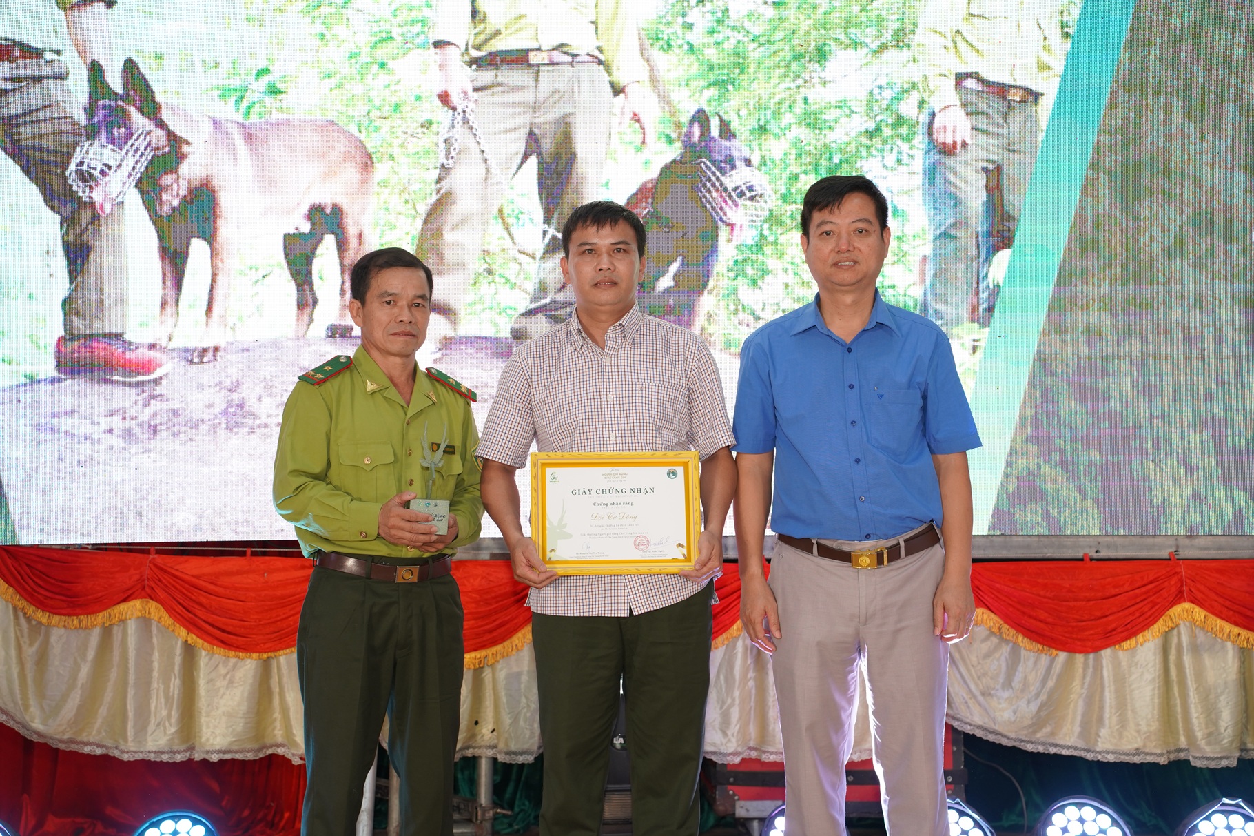 Các cán bộ Kiểm lâm Hồ Phi Sinh, Hoàng Văn Hà, và Đinh Văn Thông nhận Giải thưởng cá nhân xuất sắc Hạng mục Tuần tra chuyên trách (Từ trái sang)
